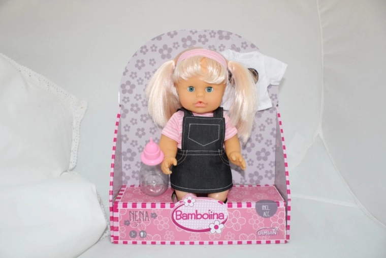 La bambola con codini biondi è presentata in un'attraente scatola rosa del marchio Bambolina – pronta a sorprendere come regalo.