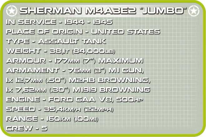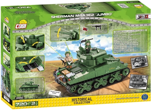 Questo modello dettagliato riproduce il famoso Sherman M4A3E2 “Jumbo” Cobra King – il primo carro ad aver sfondato le linee e raggiunto la Bastogne assediata durante l’offensiva delle Ardenne. Il set COBI offre un aspetto autentico con stampe di alta qualità che non si consumano nemmeno con un uso intenso. Grazie agli elementi funzionali, come cingoli mobili, torretta girevole e botole apribili, il modello è ideale sia per l’esposizione sia per il gioco dinamico.