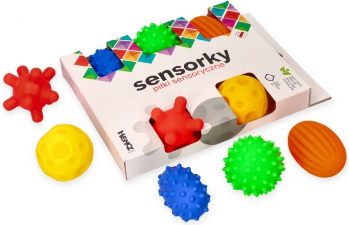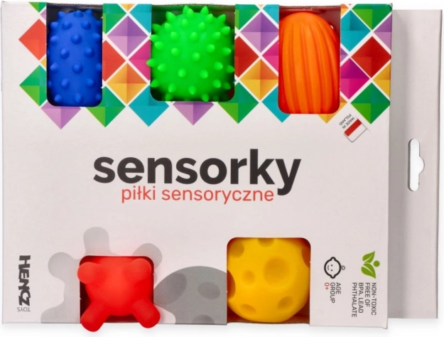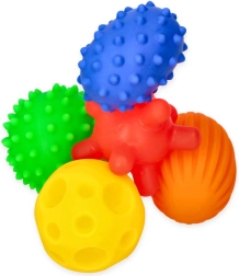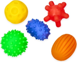 Set di 5 palline sensoriali colorate con rilievi, puntini e rigature che favoriscono la percezione di forme e superfici, la concentrazione e il naturale sviluppo dei sensi. Grazie al materiale morbido, le palline sono facili da afferrare con le manine, adatte al gioco in casa, sul tappeto e anche in vasca.