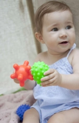 Il materiale morbido e flessibile e le forme compatte facilitano la presa con le manine. Ideali per strizzare, far rotolare e passare da una mano all’altra.