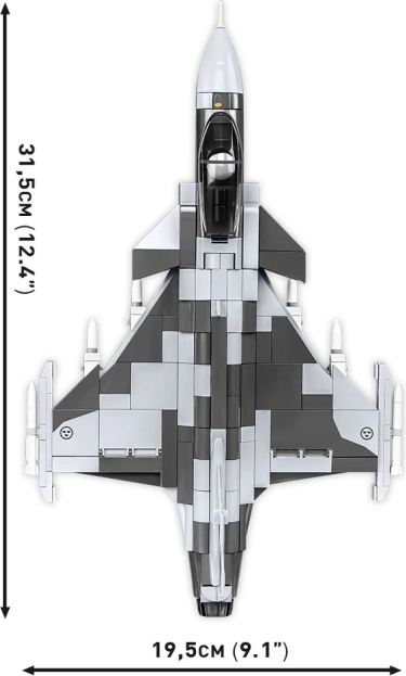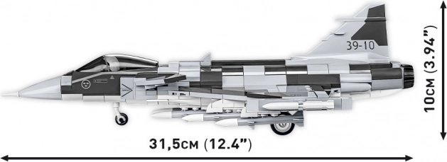 Il set di costruzioni COBI permette di costruire un modello di caccia nella scala 1:48 con alta attenzione ai dettagli. I mattoncini presentano stampe di alta qualità e il set include una base speciale con una targa con il nome del set e la bandiera svedese.