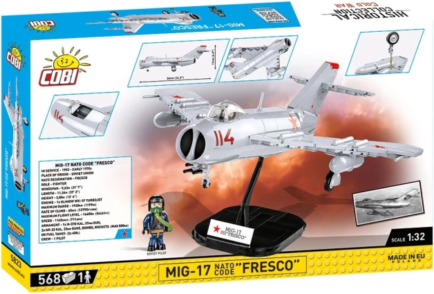 Il modellino dell'aereo MiG-17 è progettato perfettamente in scala 1:32, composto da 568 pezzi di alta qualità. Tutte le marcature e i simboli sul modello sono stampe di qualità inamovibili. Il modello include elementi mobili come le ruote e la cabina apribile, che consente di posizionare all'interno una figurina del pilota dettagliata.