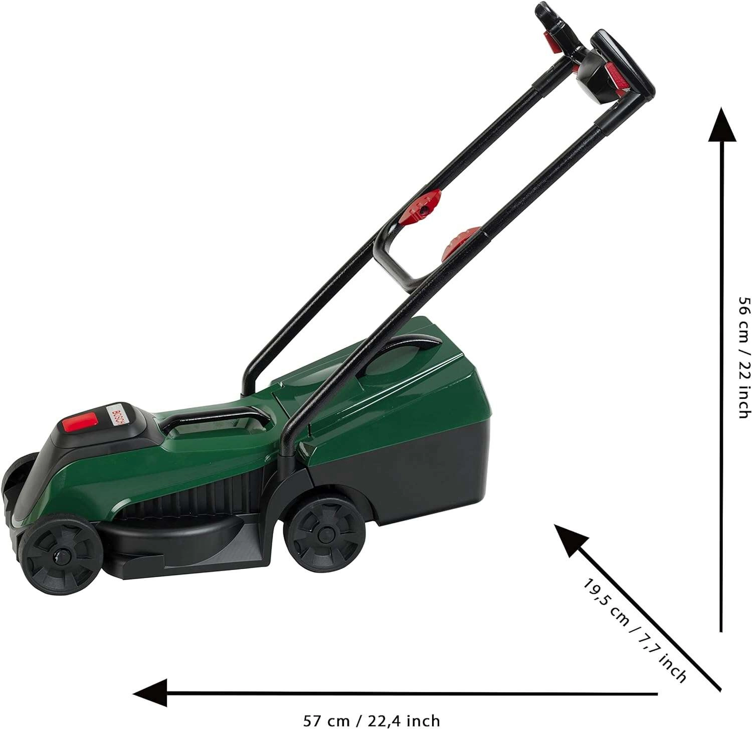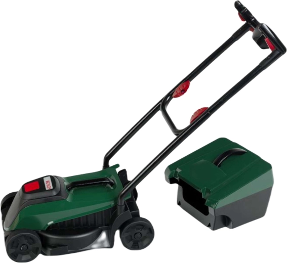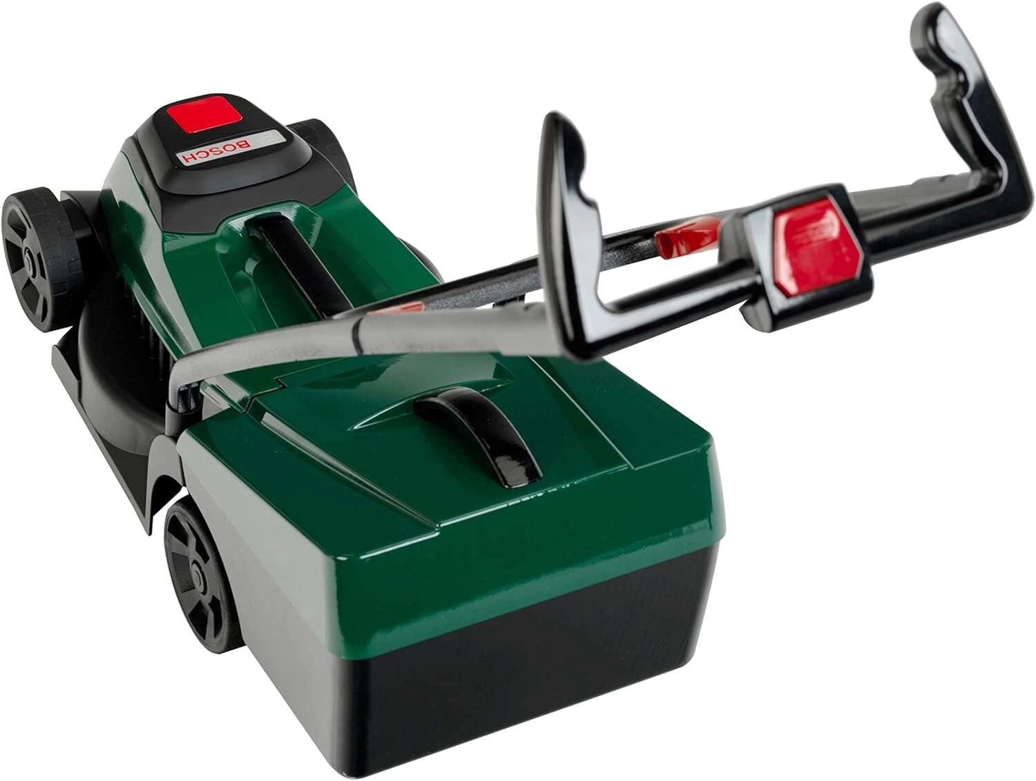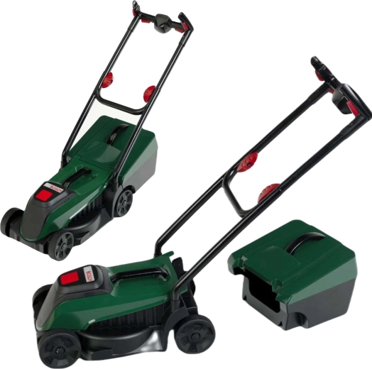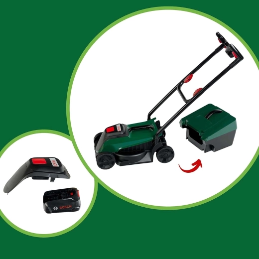 Questo tosaerba per bambini riproduce fedelmente una macchina vera: ha un corpo verde scuro, una maniglia nera e ruote mobili che scorrono senza sforzo su diverse superfici. Il modulo luminoso e sonoro integrato e rimovibile, premendo un pulsante, illumina il logo BOSCH e riproduce suoni realistici del motore. Anche senza modulo, durante la spinta si sente un piacevole clic meccanico e un rullio ritmico delle ruote.