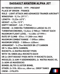 Alpha Jet è un aereo d'attacco leggero e addestratore avanzato, nato dalla collaborazione tedesco-francese e entrato in servizio negli anni '70. Questo modello a mattoncini è stato realizzato sotto licenza del produttore francese di aerei militari Dassault Aviation e completa la collezione di modelli delle Forze Armate in scala 1:48.