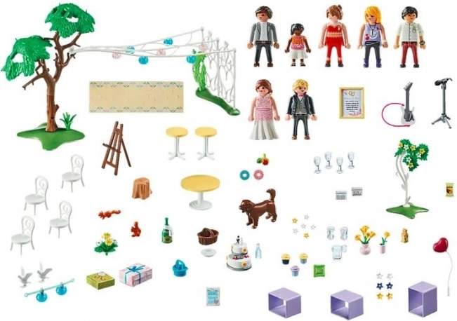 Goditi una giornata di nozze perfetta con il PLAYMOBIL Promo Pack. Musica romantica e la luce delle lanterne aggiungono atmosfera alla tua festa in giardino. La bambina sparge fiori mentre il musicista crea un'atmosfera magica. Il cane ti porta gli anelli con gioia. Questo set include: