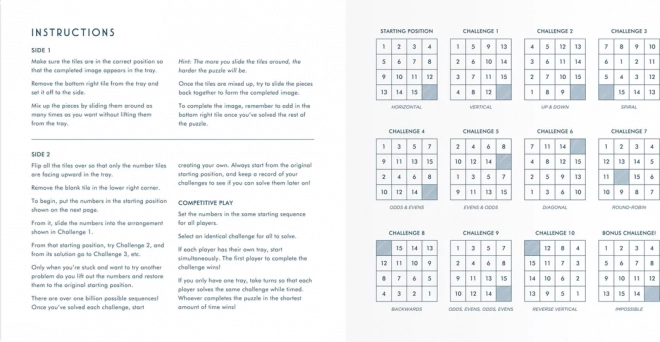 Basta rimuovere un pezzo e, facendo scorrere gli altri, comporre l’immagine, oppure girare tutti i pezzi e cimentarsi nell’enigma numerico. Più mescolate i pezzi, più la sfida diventa impegnativa. La robusta struttura in legno e le dimensioni compatte sono ideali per i viaggi, l’ufficio e la casa.