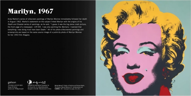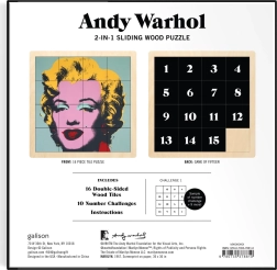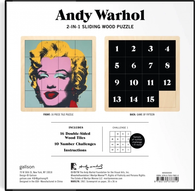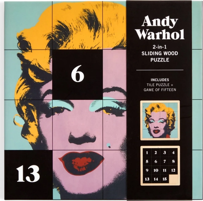 Scopri il fascino dell'arte con questi puzzle scorrevoli in legno con il tema di Andy Warhol. La combinazione dell'immagine leggendaria di Marilyn Monroe e il gioco Quindici, offre divertimento e sfida non solo per i fan dell'arte.