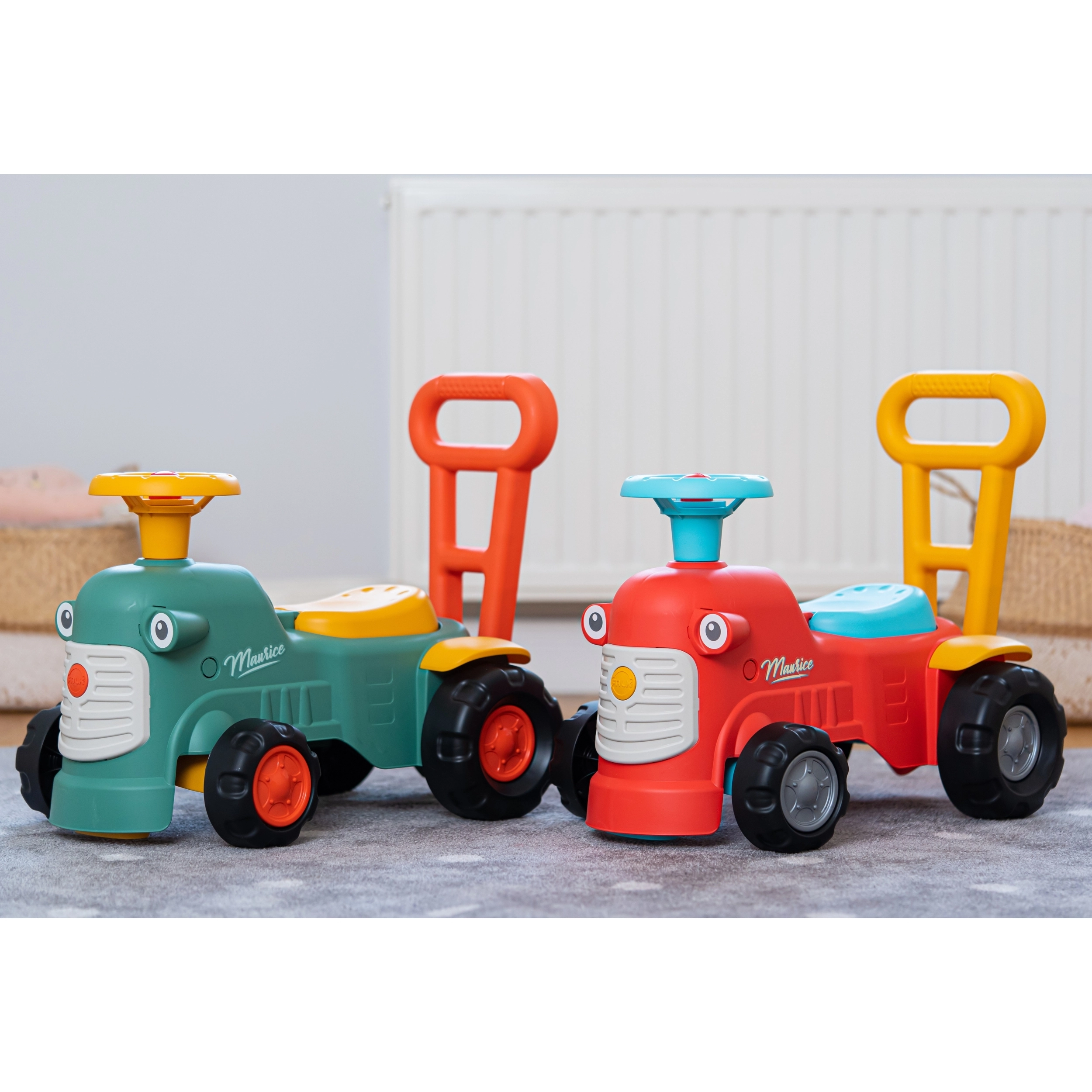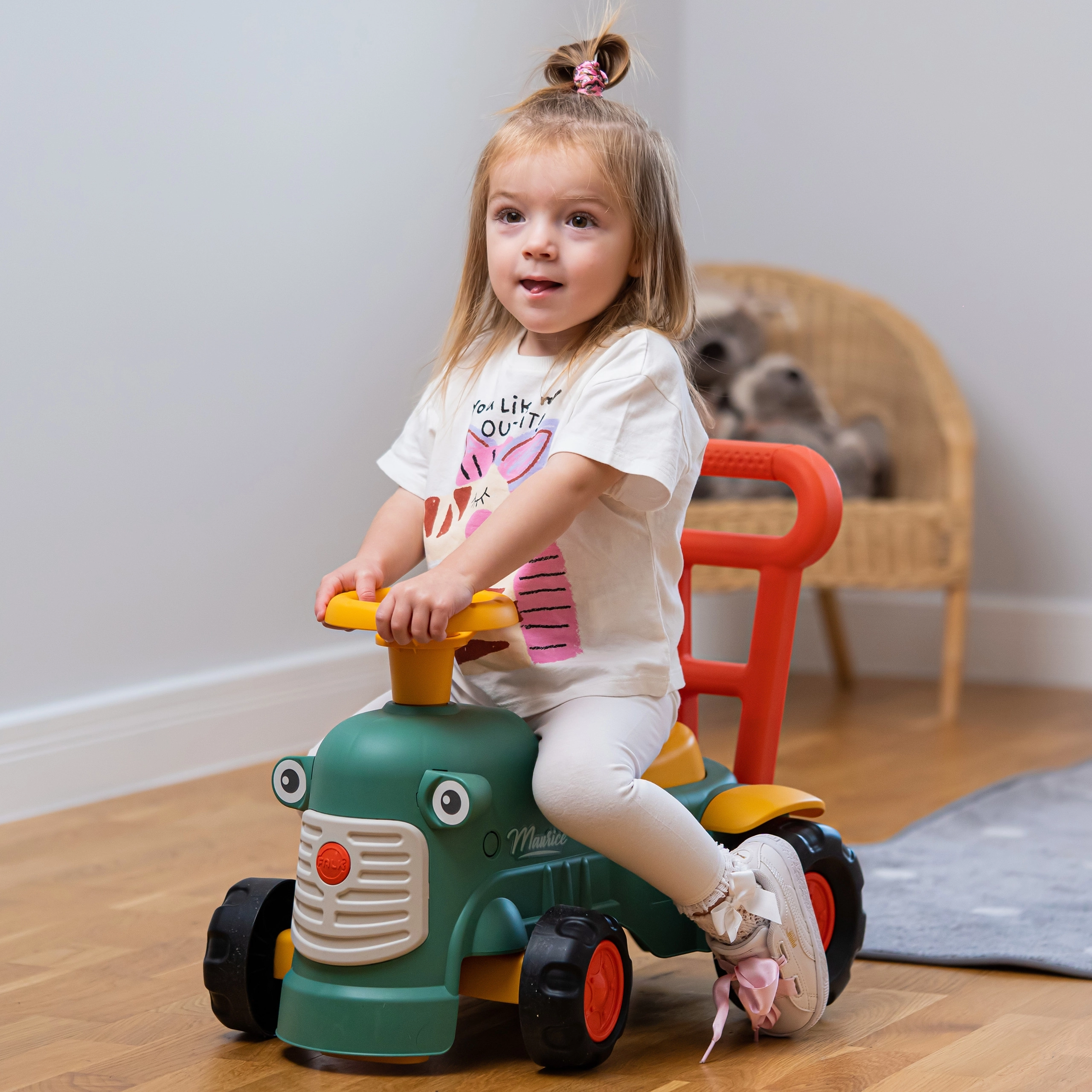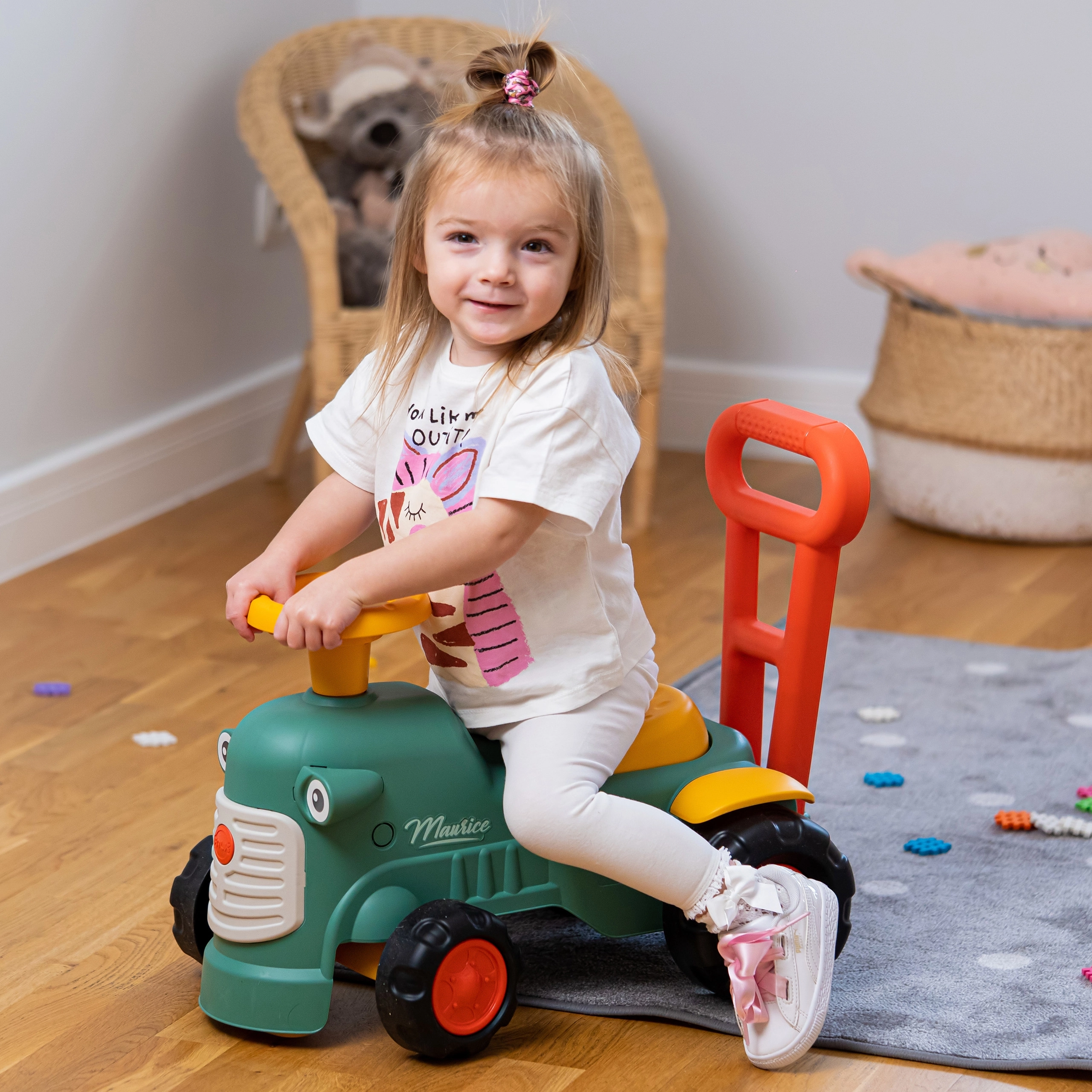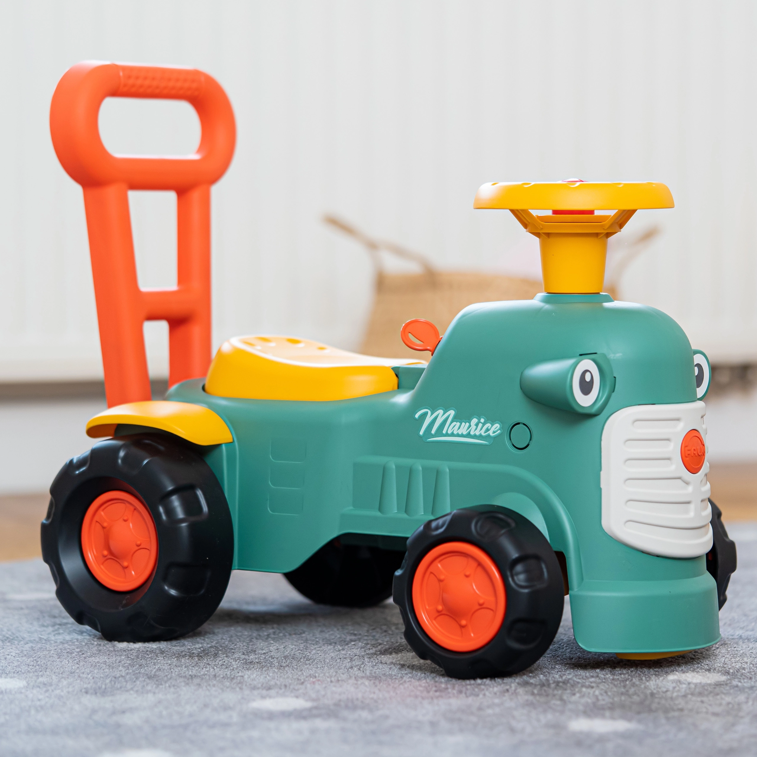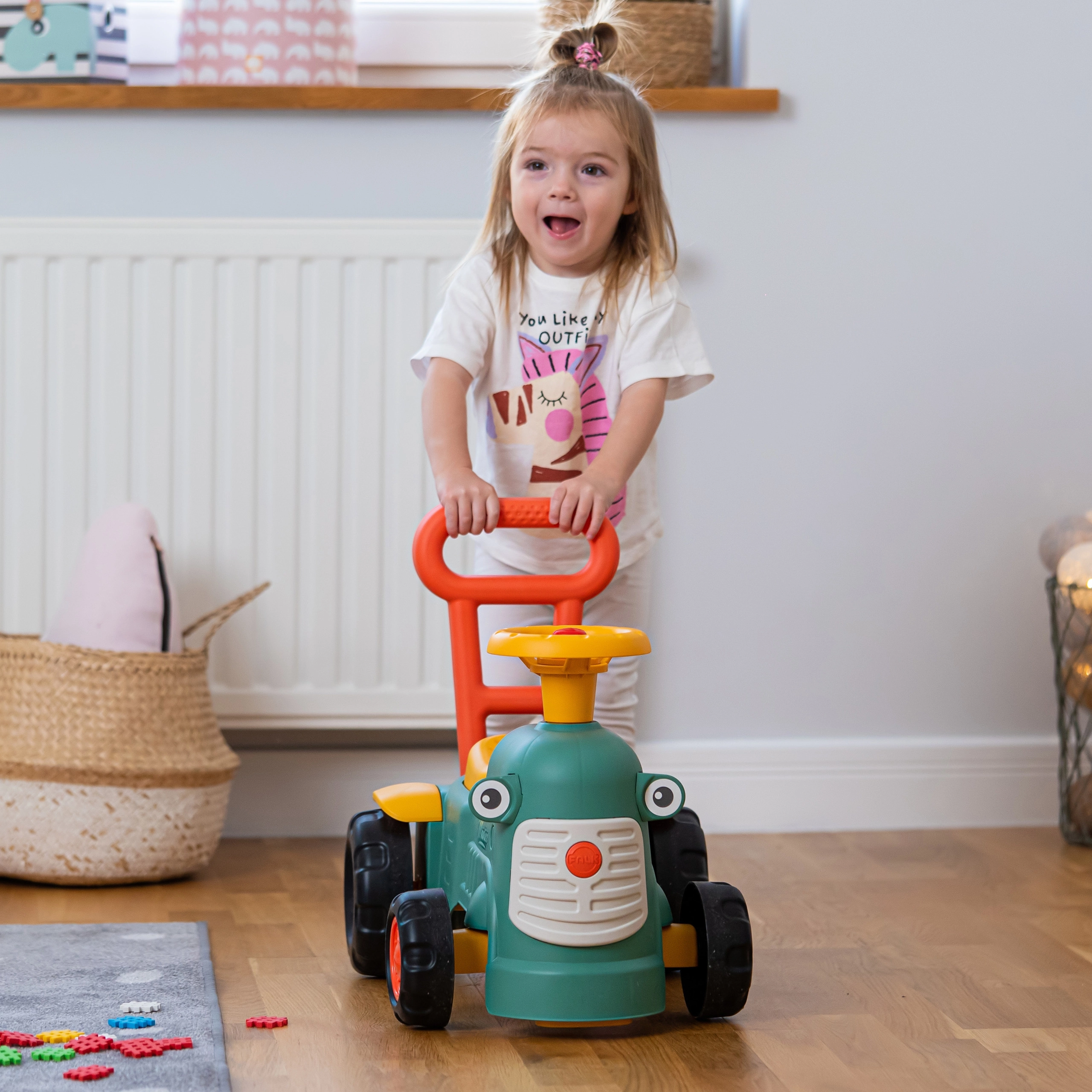 Il dolce cavalcabile a forma di trattore FALK Maurice è un ottimo compagno per i primi passi dei bambini dai 12 mesi. Grazie ai colori chiari, alle forme arrotondate e alla struttura stabile a quattro ruote, i più piccoli si divertiranno in sicurezza sia in casa che all’aperto. Il clacson sul volante, la ruota anteriore sterzante e la maniglia/schienale favoriscono lo sviluppo di motricità, equilibrio e coordinazione. Sotto la seduta c’è un pratico vano portaoggetti e i rilievi di sicurezza anti-ribaltamento offrono tranquillità a ogni corsa.