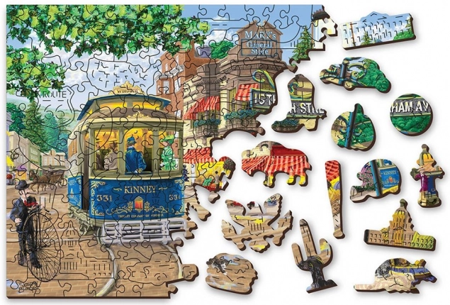 Elegante puzzle in legno con tema di una strada nostalgica, offre due modi per completarlo: il fronte con un'illustrazione dettagliata e il retro con un motivo per un montaggio basato sulle forme. Vi attende una difficoltà superiore grazie ai pezzi appositamente intagliati, che raffigurano animali, edifici e oggetti e possono fungere anche da piccole figurine. Scelta ideale per adulti e giovani puzzlisti più esperti in cerca di una sfida originale.