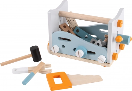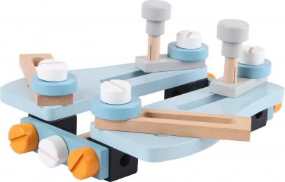 Questo gioco comprende attrezzi, come sega, martello, righello, cacciavite e chiave a brugola. Oltre a questi attrezzi, troverai anche molte viti, rondelle e elementi in legno, che possono essere collegati e avvitati, offrendo così molte ore di divertimento.