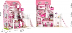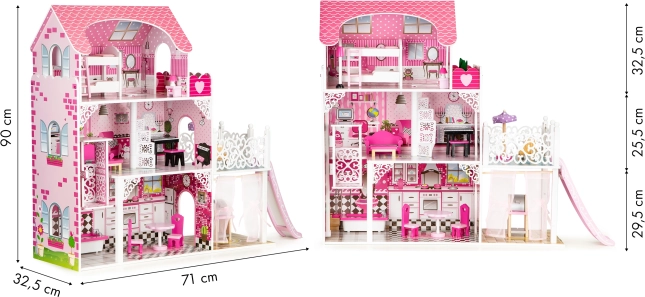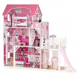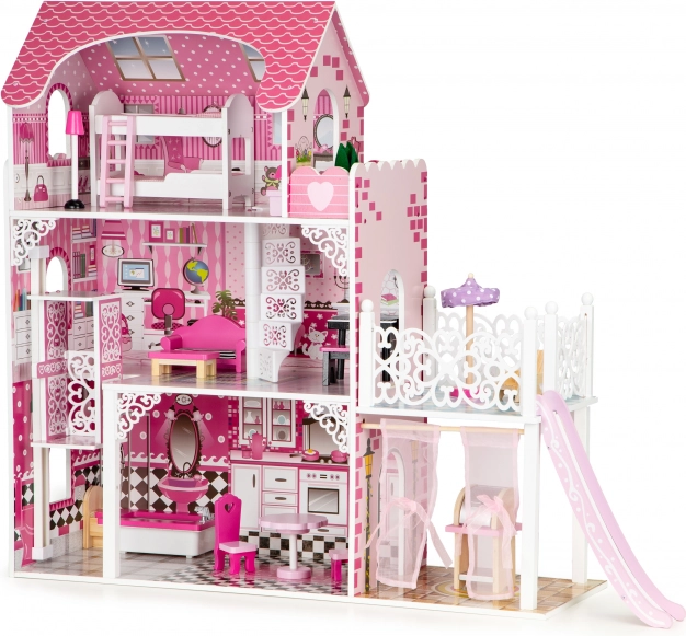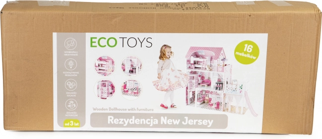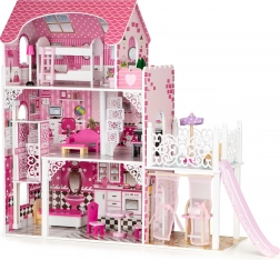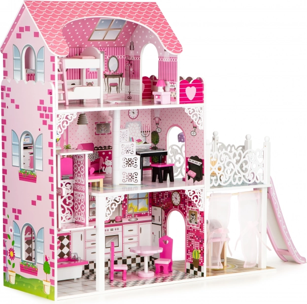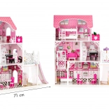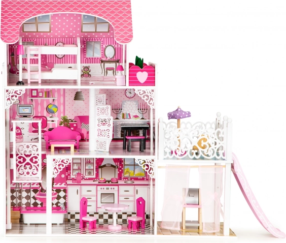 La casa delle bambole ECOTOYS è un luogo perfetto per tutte le piccole amanti del gioco fantasioso. Offre 3 livelli indipendenti e un totale di 7 stanze, che imitano perfettamente una vera casa abitativa. Ogni stanza è rifinita in uno stile diverso, permettendo ai bambini di fare i designer d'interni e disporre i mobili secondo la propria immaginazione.