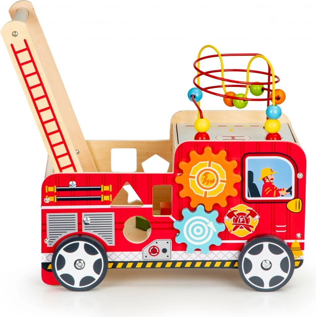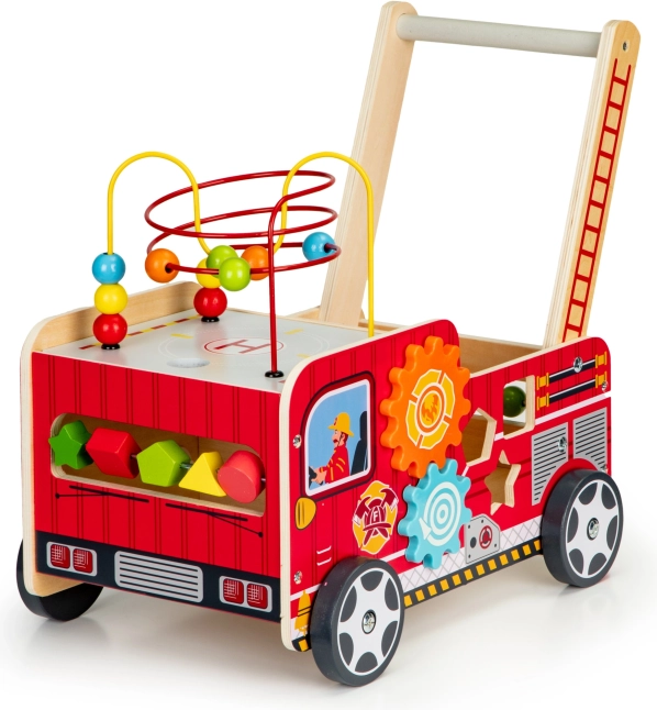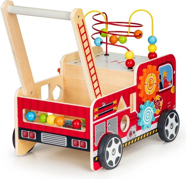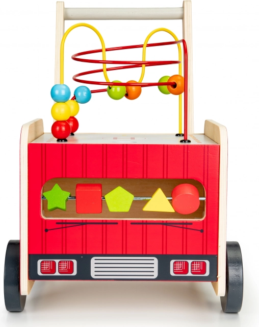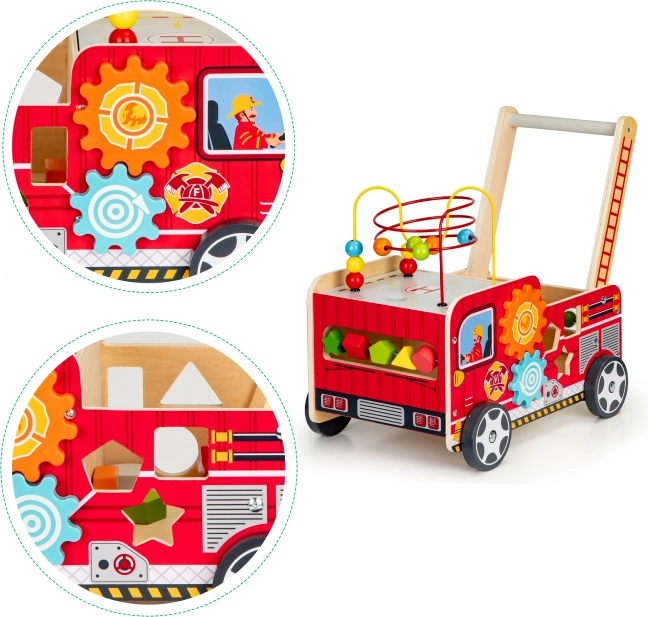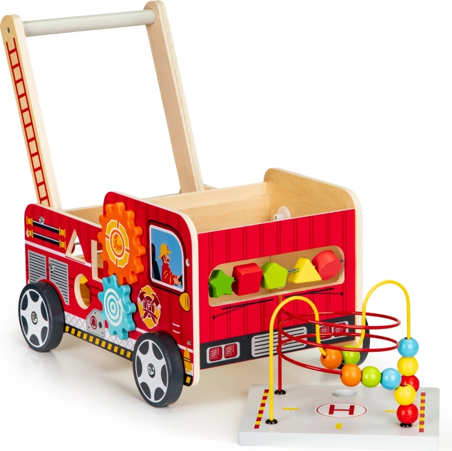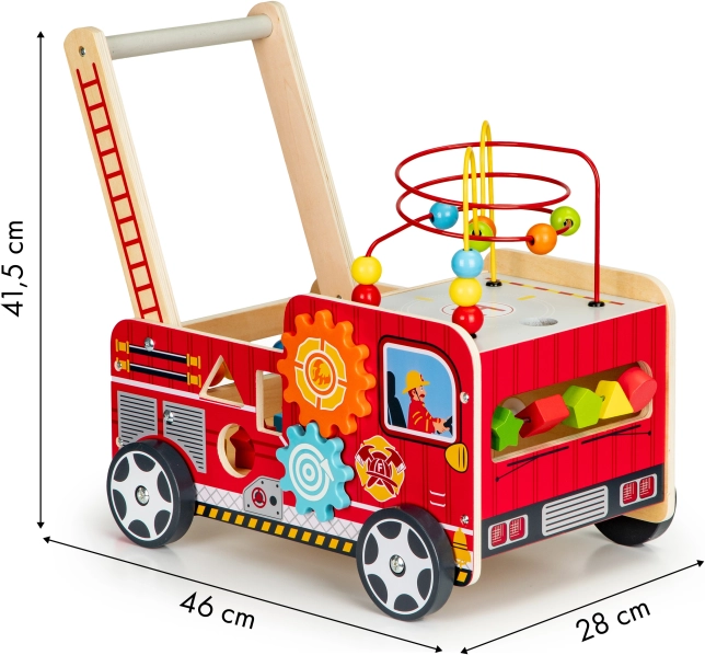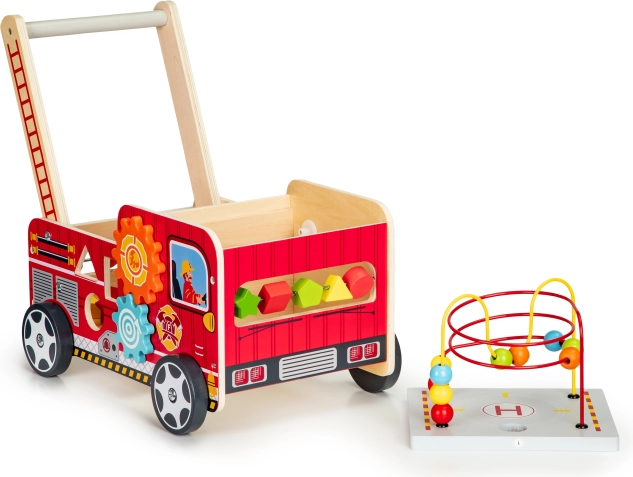 Il girello in legno a forma di camion dei pompieri è un assistente ideale per i primi passi del vostro bambino. Il girello è progettato per offrire stabilità e al contempo divertimento attraverso vari elementi interattivi come ingranaggi, labirinti con perline, e smistatori di forme.
