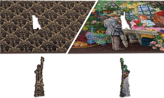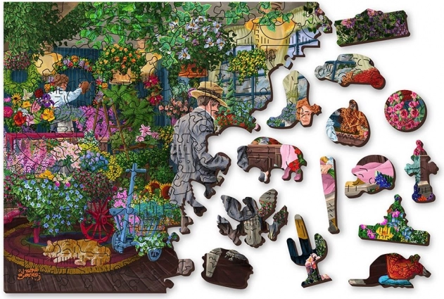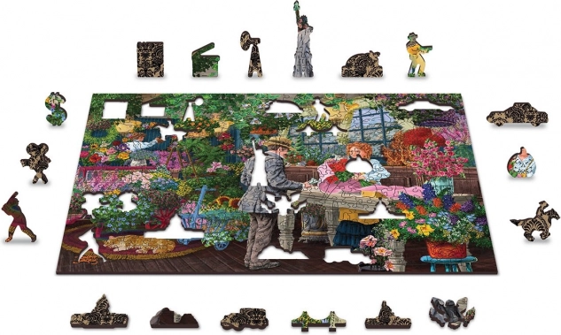 Questo elegante puzzle in legno con il tema di un vivace fioraio conquisterà gli amanti delle illustrazioni dettagliate e delle sfide più impegnative. Grazie alla struttura bifacciale, ti godi due puzzle in uno: fronte con una scena colorata ricca di fiori e retro con un motivo per comporre seguendo le forme. I ritagli unici a forma di animali, personaggi e oggetti funzionano come piccole figurine e aggiungono una nuova dimensione all’esperienza.