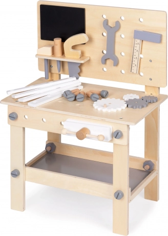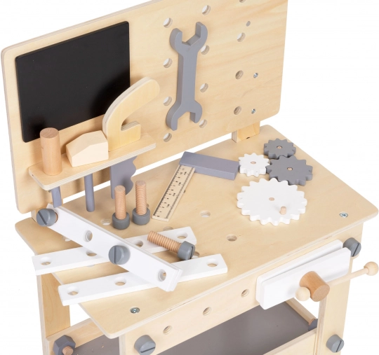 Inclusi una morsa funzionante e ingranaggi azionati che insegnano i principi base delle trasmissioni. Utensili e accessori sono interamente in legno, lisci e dipinti con colori sicuri. Il pannello superiore forato aiuta a organizzare gli attrezzi in modo ordinato; è presente anche una lavagnetta per appunti e schizzi.