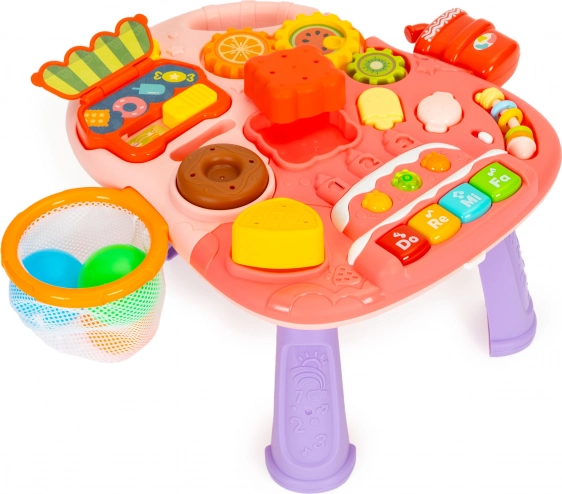 - Pannello educativo: dotato di un pianoforte colorato, giochi a ingranaggi, un ordinatore di forme e un canestro da basket