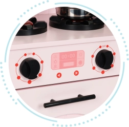 Le manopole girevoli sulla cucina permettono di simulare la cottura sui fornelli e nel forno. I bambini ottengono così uno spazio sicuro per i loro esperimenti culinari.