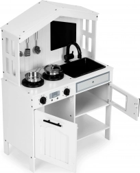 La cucina in legno ECOTOYS destinata ai bambini dai 3 anni è il modo perfetto per sviluppare la loro immaginazione e abilità manuali. La cucina offre molte funzioni di una cucina reale, inclusi manopole girevoli che consentono al bambino di simulare la regolazione della temperatura nel forno e sui fornelli. È sicura, grazie all'assenza di spigoli vivi e alla costruzione stabile con materiali di qualità.