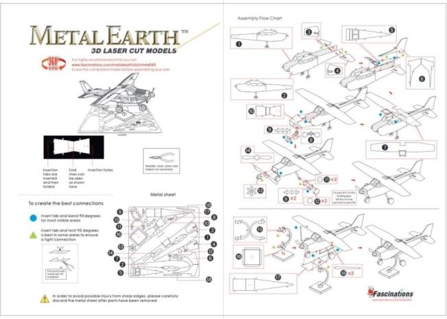 Rimuovi i singoli pezzi dai fogli metallici; se necessario, usa piccole tronchesine (non incluse). I pezzi si collegano tra loro tramite linguette e fori che formano incastri. Piega la linguetta con piccole pinze a becchi sottili (non incluse) e unisci progressivamente tutti gli incastri fino a ottenere un capolavoro molto realistico!