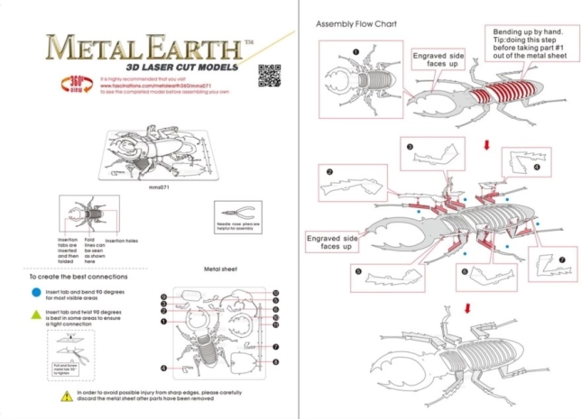 Rimuovi i singoli pezzi dai fogli metallici; se necessario usa una piccola tronchesina (non inclusa). I pezzi si collegano tra loro tramite linguette e fori a incastro. Piega la linguetta con una piccola pinza a becchi sottili (non inclusa) e collega progressivamente tutti gli incastri fino a ottenere un capolavoro molto realistico!