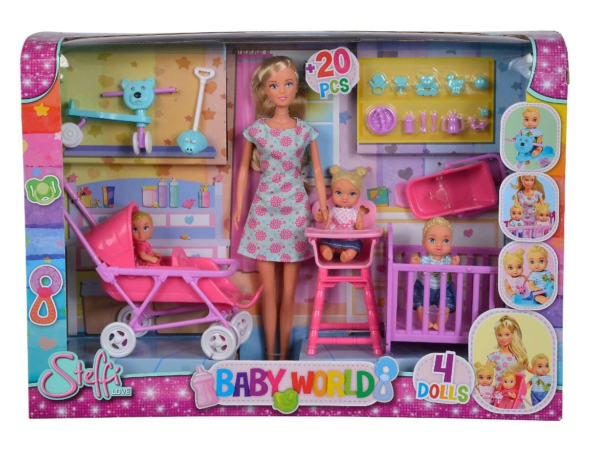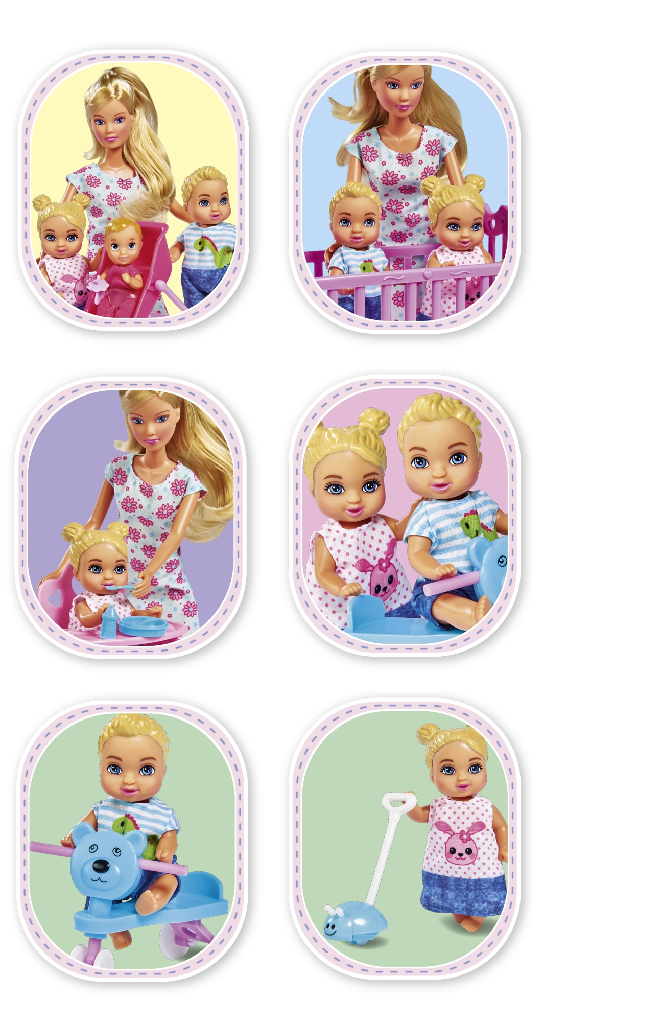 Bambola Steffi (mamma), 3 bebè, lettino/culla, seggiolone, passeggino 2 in 1, marsupio/porta-bebè, cavalcabile/monopattino, giochi e accessori per la pappa (biberon, ciotolina, posate), ciuccio, massaggiagengive