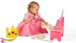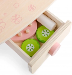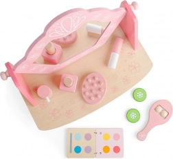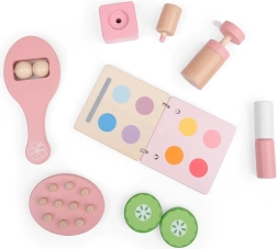 Incluso un ricco set di accessori in legno per un gioco realistico: palette compatta, “fettine di cetriolo”, rullo massaggiante, spazzola per capelli, rossetto, profumo e smalto per unghie. Durante il gioco i bambini sviluppano abilità sociali, fantasia e coordinazione occhio–mano.