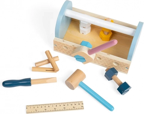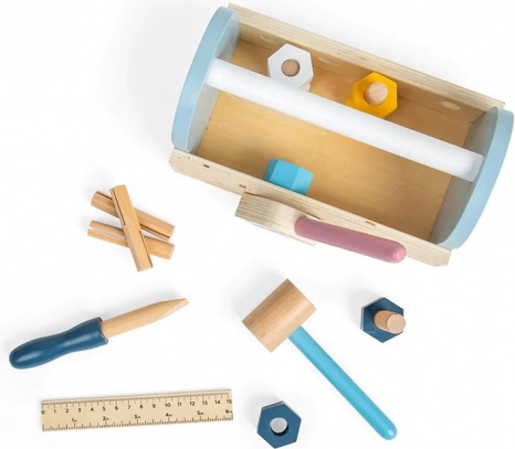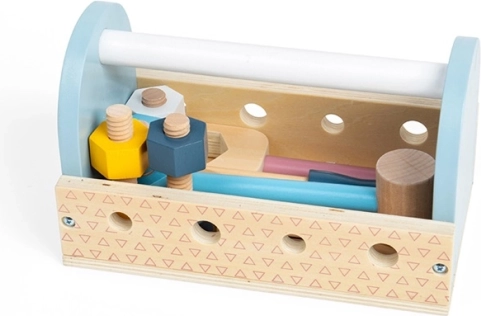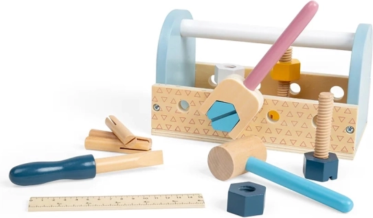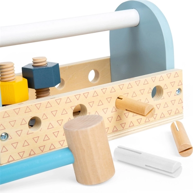 La cassetta degli attrezzi in legno è la scelta ideale per le prime avventure da piccoli riparatori. I bambini possono martellare, stringere e misurare, sviluppando durante il gioco la coordinazione mano–occhio, la pazienza e il vocabolario. Le dimensioni compatte e la pratica maniglia permettono di portare il set ovunque.