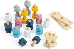 Questo intramontabile set in legno con dadi, viti e listelli forati incoraggia i bambini a scoprire i primi principi del gioco di costruzione. I delicati colori pastello, la piacevole texture del legno e le forme sicure stimolano la percezione sensoriale e l’immaginazione.