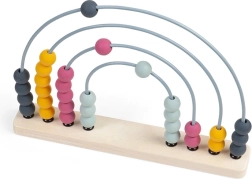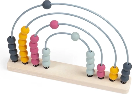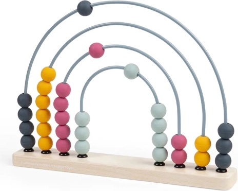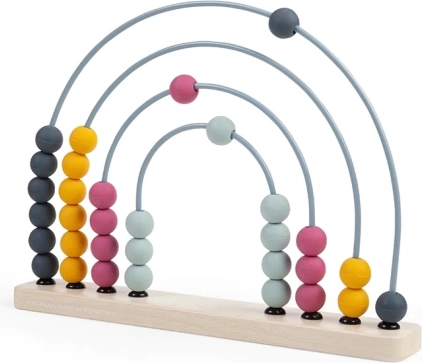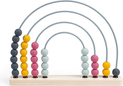 La base è realizzata in legno certificato FSC®, gli archi sono in metallo e le palline in silicone di qualità alimentare. Grazie ai colori pastello senza tempo e alla forma ad arcobaleno, è anche un elemento di design. Dopo il gioco può decorare la mensola e continuare a invogliare a scoprire i numeri.