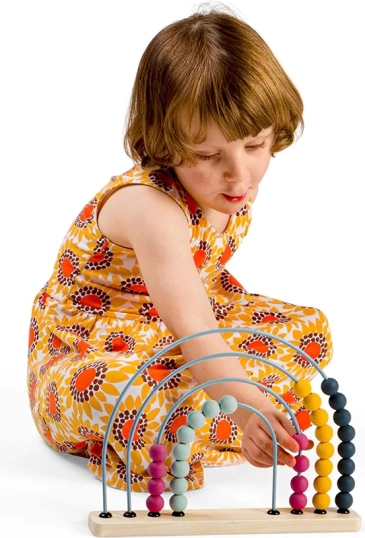 Far scorrere le perline sugli archi metallici migliora la presa, la coordinazione occhio–mano e la pazienza dei bambini.