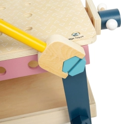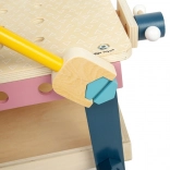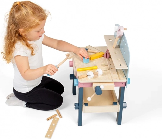 Elegante banco da lavoro in legno per piccoli artigiani che favorisce la motricità fine, la coordinazione occhio–mano e il gioco creativo. Include un ricco set di attrezzi: sega, chiave, martello, cacciavite, squadra e tanti dadi e viti. Realizzato in legno certificato FSC e dipinto con vernici atossiche in delicati toni neutri che si adattano perfettamente a qualsiasi cameretta.