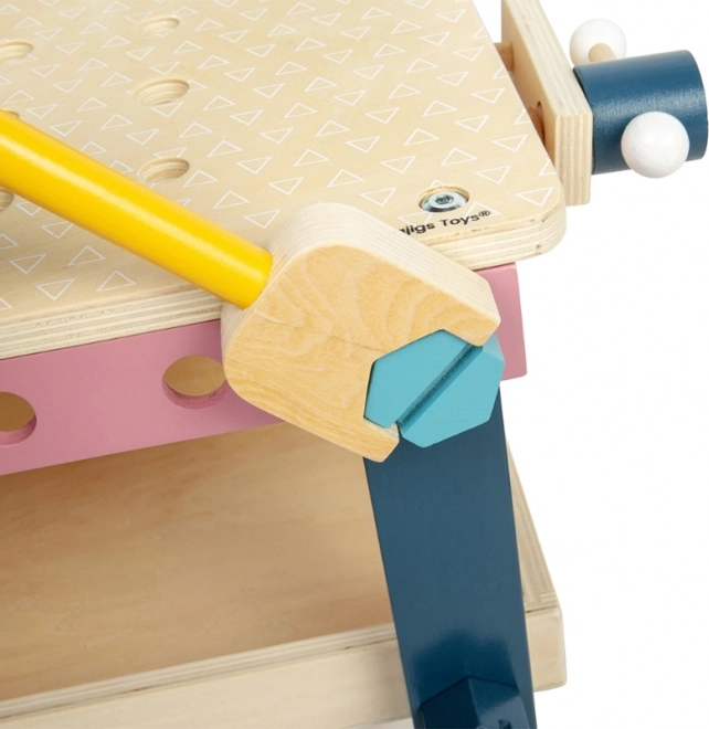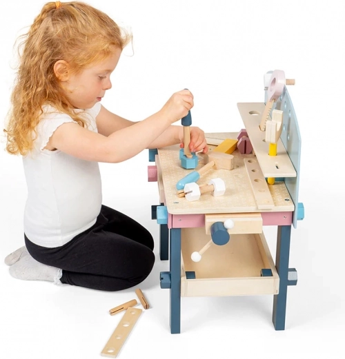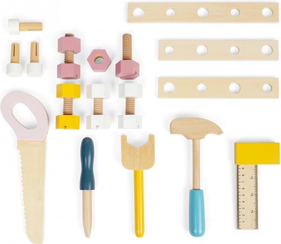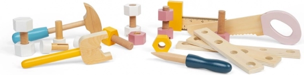 Comprende sega, chiave, martello, cacciavite, squadra, dadi e viti – tutto in colori pastello, pronto per creare.