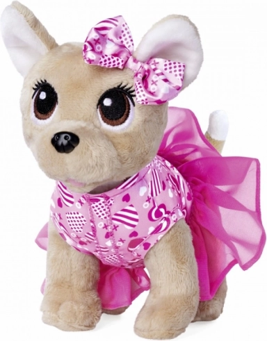 Cagnolino di peluche chihuahua in stile festivo. Cagnolino di peluche con abito scintillante a motivo di cuoricini e fiocco coordinato. Riposto in una borsetta scintillante a forma di cuore. Miglior amico: l’adorabile piccolo chihuahua è alto 20 cm ed è realizzato in morbido peluche.
