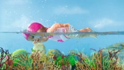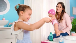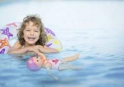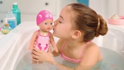 Il corpo leggero e impermeabile della bambola è ideale per vasca e piscinetta: il bambino osserva come la bambola nuota e galleggia sulla superficie.