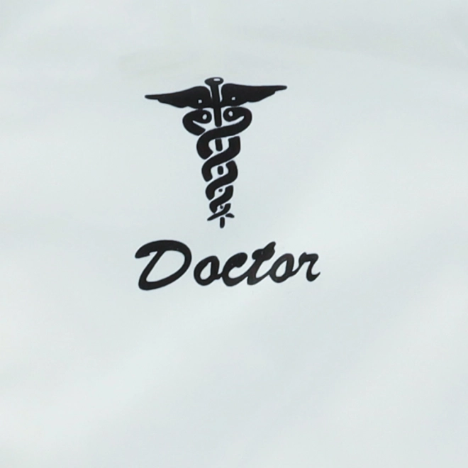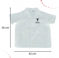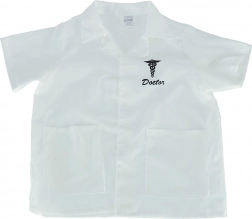 Camice medico bianco con maniche corte, due tasche e simbolo del Caduceo con scritto 'Doctor'.