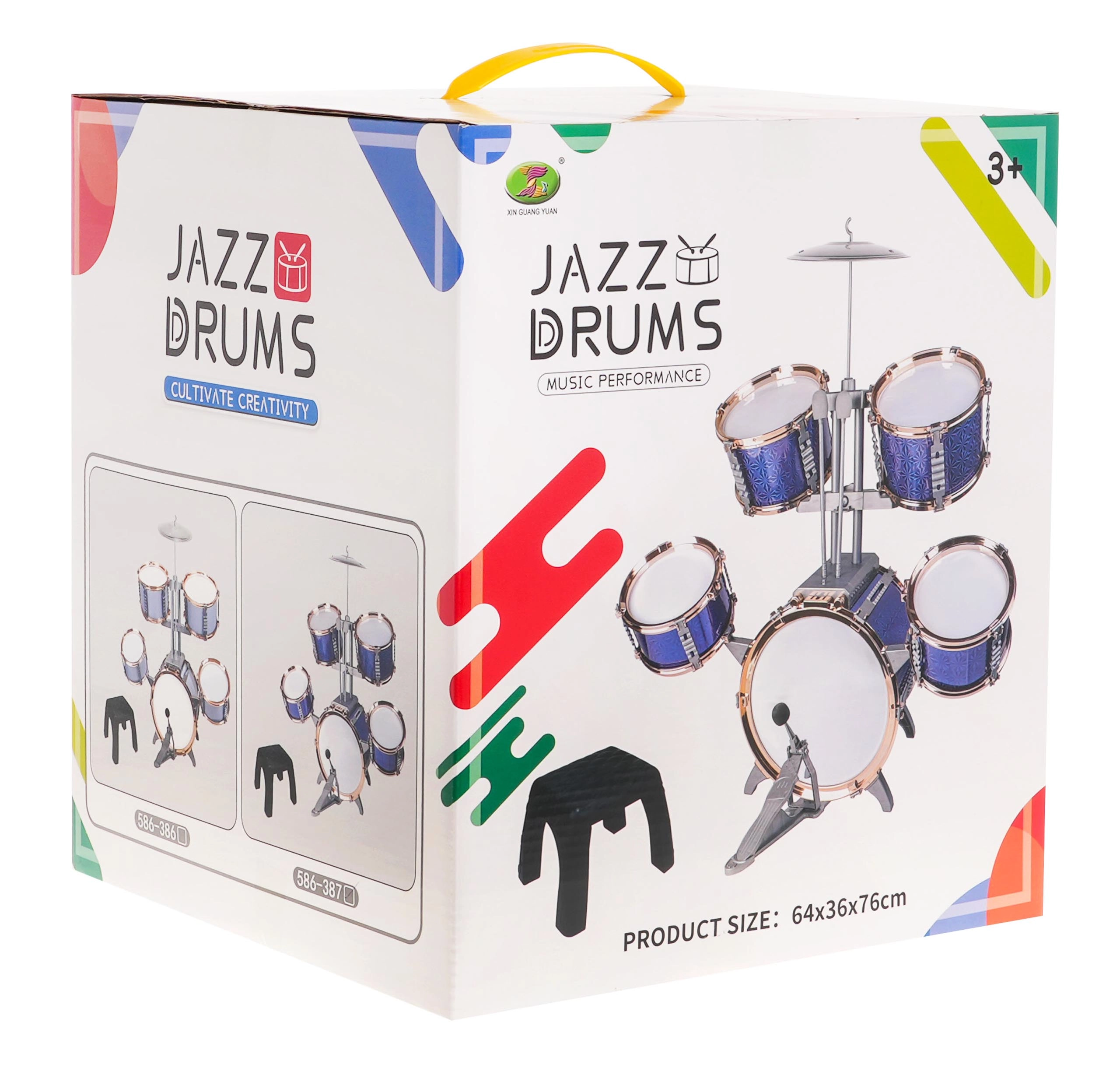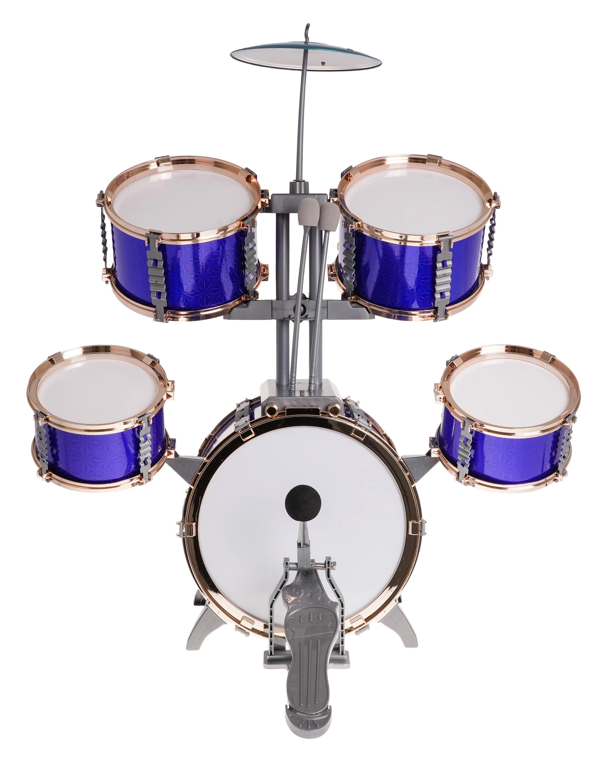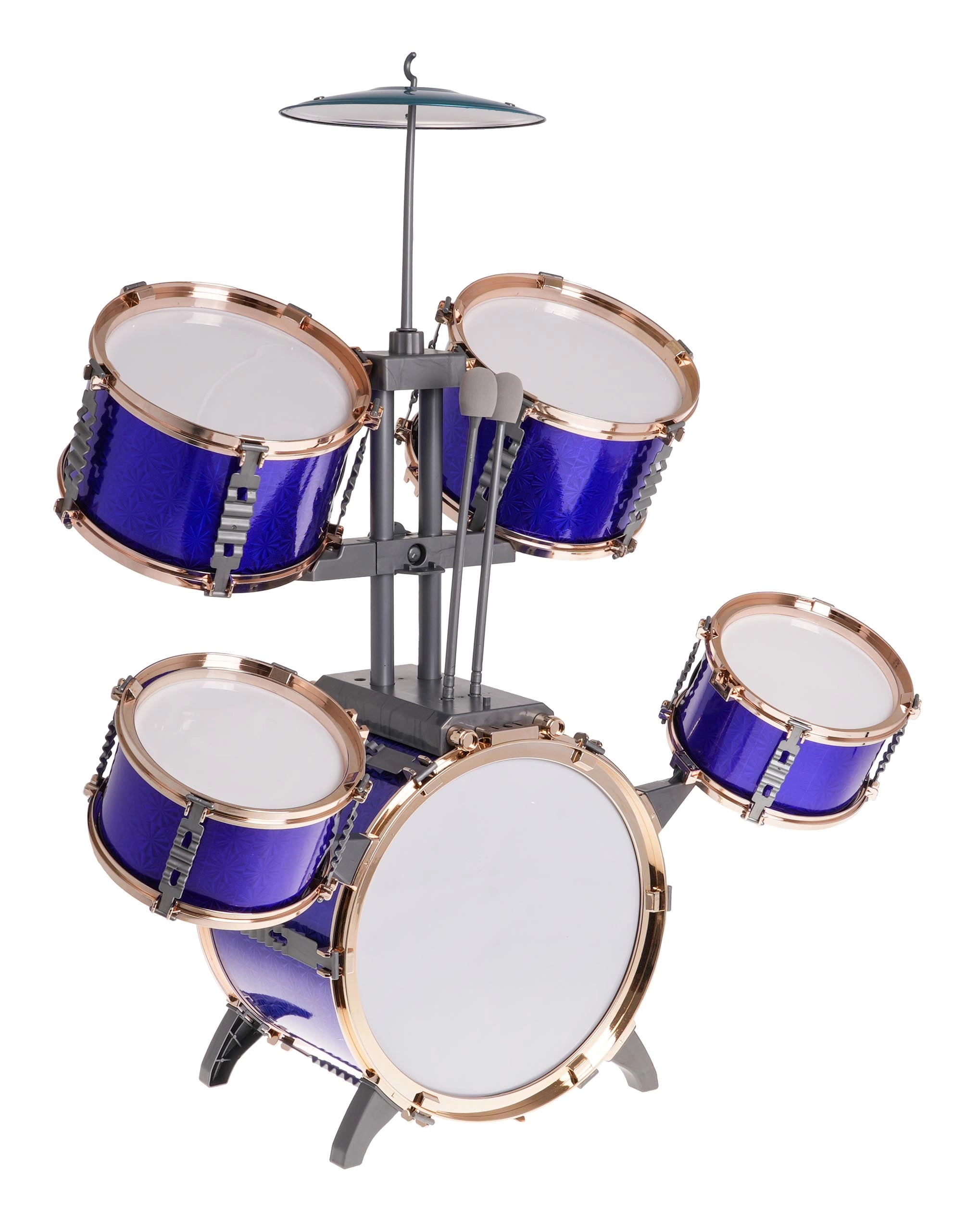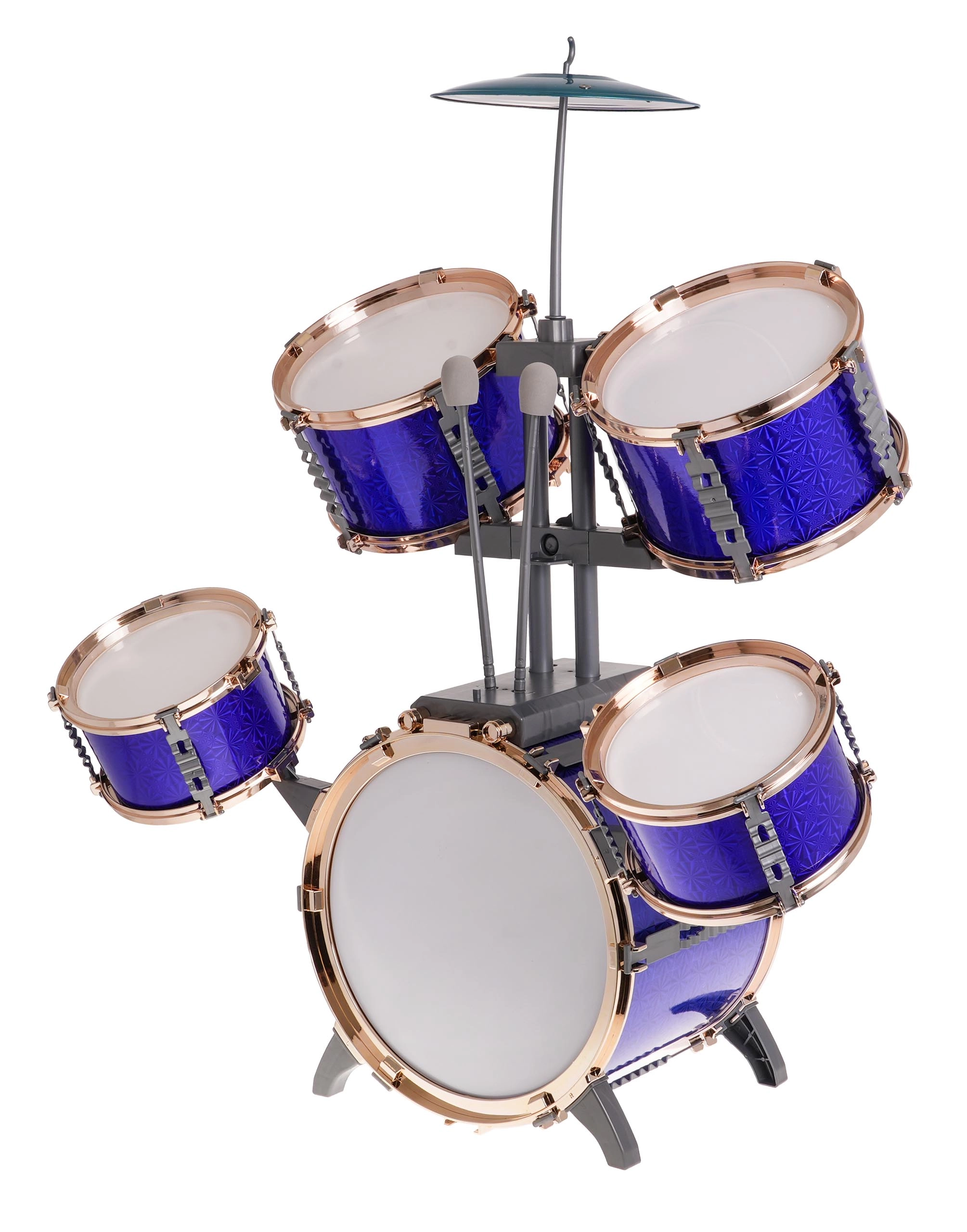- Set completo: 5 tamburi, piatto in metallo, 2 bacchette, sgabello
