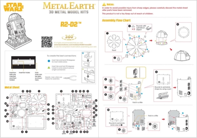Rimuovi i singoli pezzi dalle lamine metalliche; se necessario, usa piccole tronchesi (non incluse). I pezzi si collegano tra loro tramite incastri formati da un gancio (linguetta) e un foro. Piega la linguetta con piccole pinze a becchi sottili (non incluse) e unisci progressivamente tutti gli incastri fino a ottenere un capolavoro dall’aspetto molto realistico!