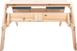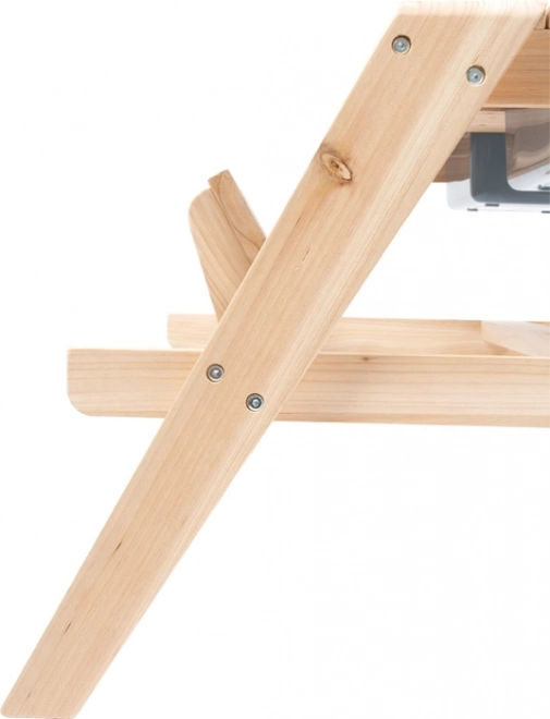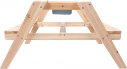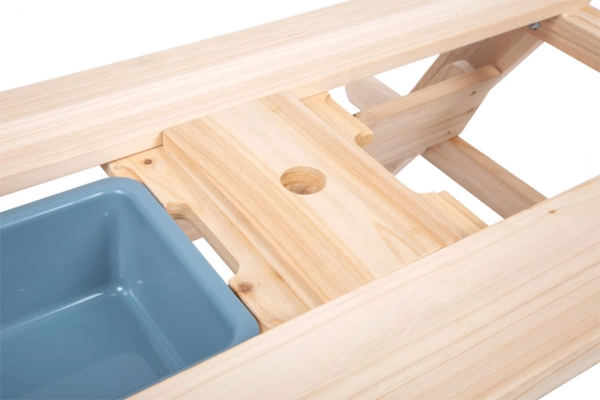 Il tavolo in legno funge sia da tavolo da picnic che da area di gioco con vaschette per sabbia o acqua.