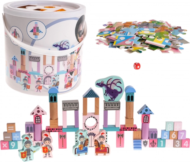 Il castello di costruzioni in legno con cavalieri è progettato per stimolare l'immaginazione dei bambini e l'apprendimento di forme e colori. Include 66 elementi, tra cui puzzle che mostrano scene imponenti di castelli e draghi. Con questo set unico, i bambini imparano a creare strutture complesse e esercitano le loro abilità in tre categorie di età.
