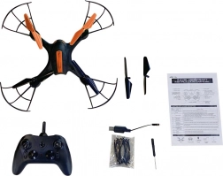 Drone, radiocomando, cavo di ricarica USB, eliche di ricambio, cacciavite, manuale (EN)