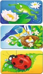 Puzzle in due pezzi con bellissime immagini create appositamente per i bambini più piccoli. I pezzi robusti e resistenti sono realizzati in cartone extra spesso e favoriscono nei bambini lo sviluppo della motricità, della concentrazione e della fantasia. Tra le nove immagini troverete gli animali preferiti che si possono incontrare in giardino e nei dintorni: farfalla, riccio, coccinella e altri. Dimensioni del puzzle assemblato: ca. 18 x 10 cm