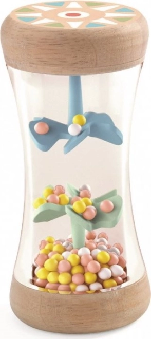 Il grazioso sonaglio combina il legno con un cilindro trasparente in plastica, in cui cadono perline arcobaleno e ruotano piccole eliche. Con il movimento crea un piacevole e calmante effetto “rainstick”, che incuriosisce il bebè e sostiene la sua concentrazione.
