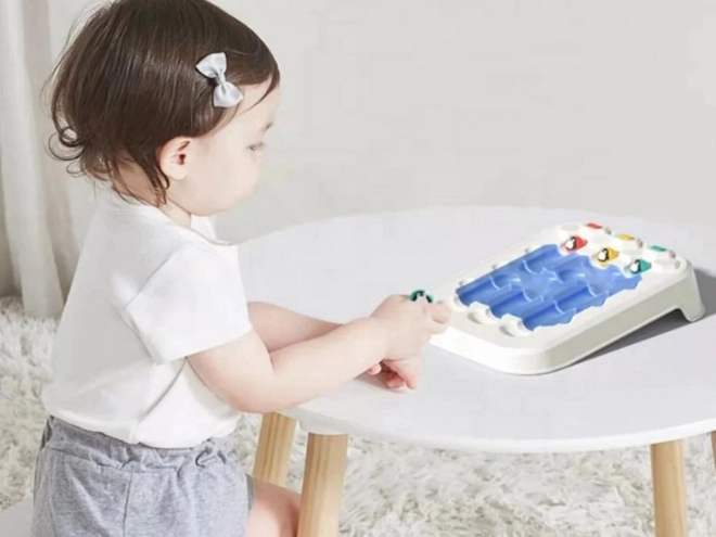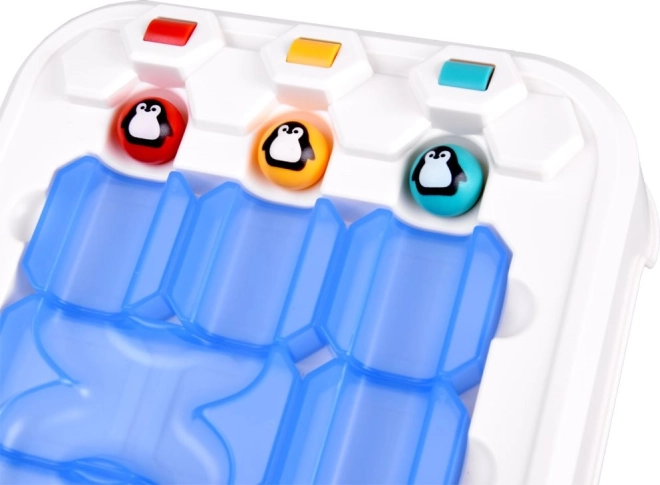 Il gioco include tre palline colorate con immagini di pinguini allegri, rendendo il gioco divertente e attraente per i bambini.