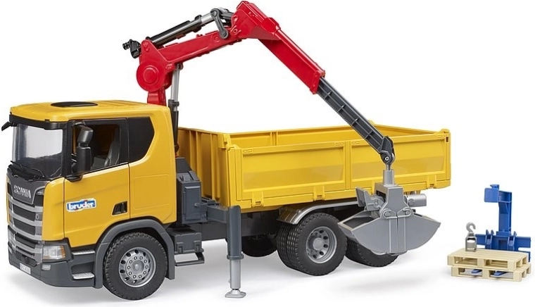 Per facilitare il trasporto dei materiali ci sono pianale ribaltabile e sponde richiudibili. La confezione include pratici accessori: due pallet, forche per pallet e pinza con benna, così i bambini possono iniziare subito i lavori in cantiere.