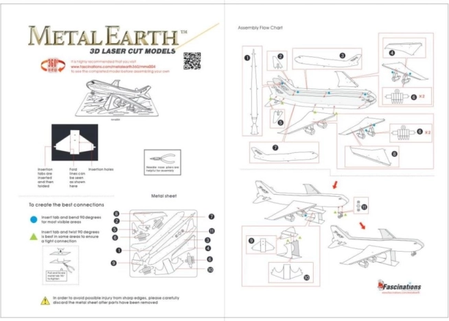 Rimuovete i singoli pezzi dai fogli metallici; se necessario, utilizzate piccole tronchesine (non incluse). I pezzi si uniscono tramite incastri costituiti da una linguetta e un foro. Piegate la linguetta con piccole pinze a becchi fini (non incluse) e collegate via via tutti gli incastri fino a ottenere un capolavoro dall’aspetto molto realistico!
