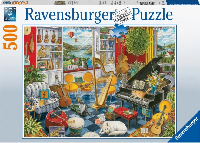 Scoprite la qualità del montaggio con il puzzle Ravensburger – motivo Stanza della Musica con 500 pezzi, che offre relax, allenamento della concentrazione e una bellissima immagine finale di circa 49 × 36 cm.