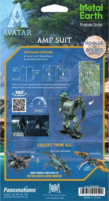 La serie Premium di Metal Earth propone un modello realistico dell’AMP Suit dall’universo di Avatar, ricavato da fogli d’acciaio tramite incisione laser. Ogni pezzo combacia perfettamente con l’altro, così da creare un impressionante pezzo da collezione senza colla né saldatura, con dettagli autentici e un caratteristico look militare.