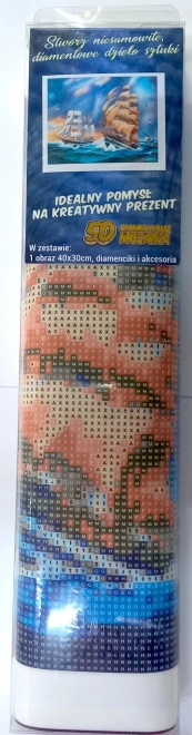 Pittura diamantata - procedura: La parte superiore della tela è ricoperta di adesivo e protetta da una pellicola trasparente. Rimuovi la pellicola gradualmente, a sezioni, man mano che applichi le gemme. La tela contiene simboli indicati nella legenda allegata, che rimandano al sacchetto di gemme corrispondente contrassegnato da un numero. Versa le gemme del sacchetto nella vaschetta. Carica la cera sulla punta della penna, grazie alla quale le gemme aderiranno facilmente alla penna. Applica le gemme sull’immagine con la penna, quindi rimettile nel sacchetto e prosegui con il colore successivo.
