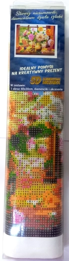 Pittura diamante - procedura: La parte superiore della tela è rivestita di colla e coperta con una pellicola trasparente. Rimuovere gradualmente la pellicola a mano a mano che si applicano i cristalli. La tela contiene simboli secondo la leggenda, che si riferiscono ai sacchetti di cristalli colorati. Carica la penna di cera e applica i cristalli nei punti appropriati.