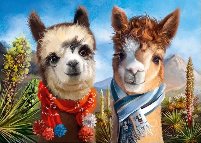La simpatica coppia di alpaca con sciarpe colorate sullo sfondo delle montagne porterà a casa tua energia positiva e motivazione a completare il puzzle.