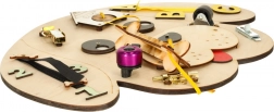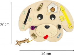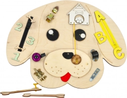 Divertente tavola sensoriale in legno a forma di cane che sviluppa nei bambini la motricità fine, la logica e la concentrazione. Include numeri e lettere in legno colorati, cerniera lampo, fibbiette e chiavistelli, campanellino e altri elementi interattivi che favoriscono l’apprendimento attraverso il gioco e lo sviluppo sensoriale.